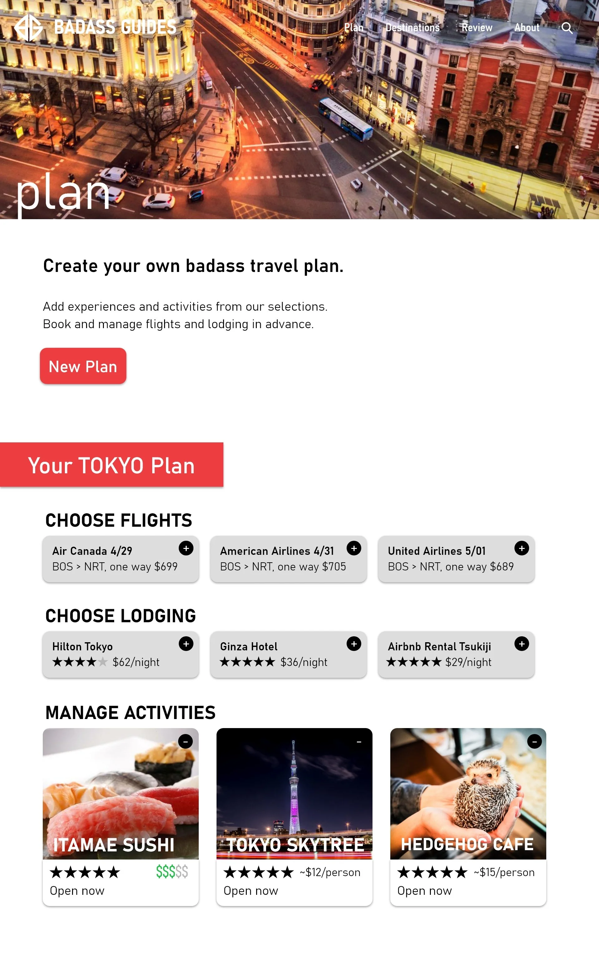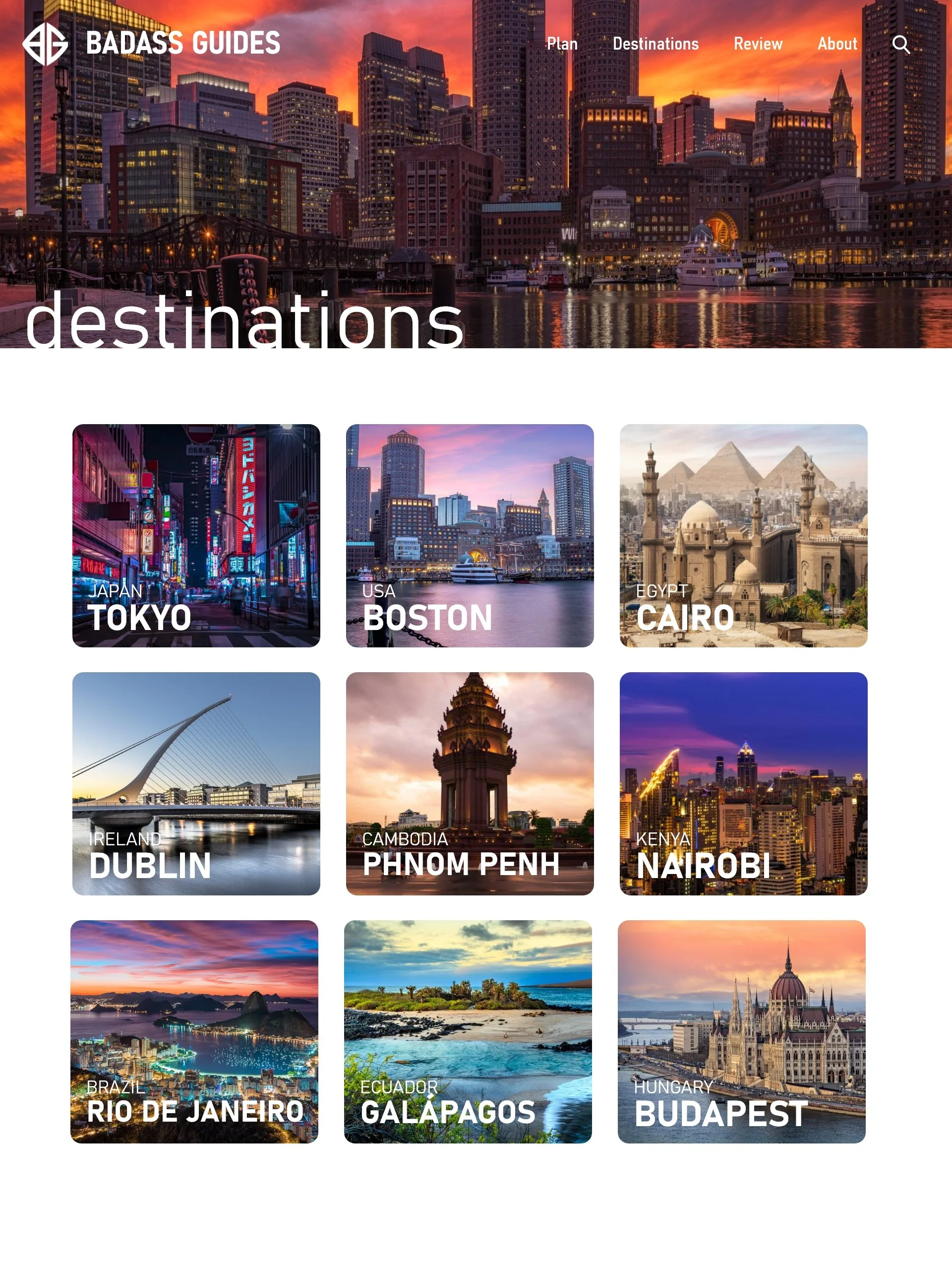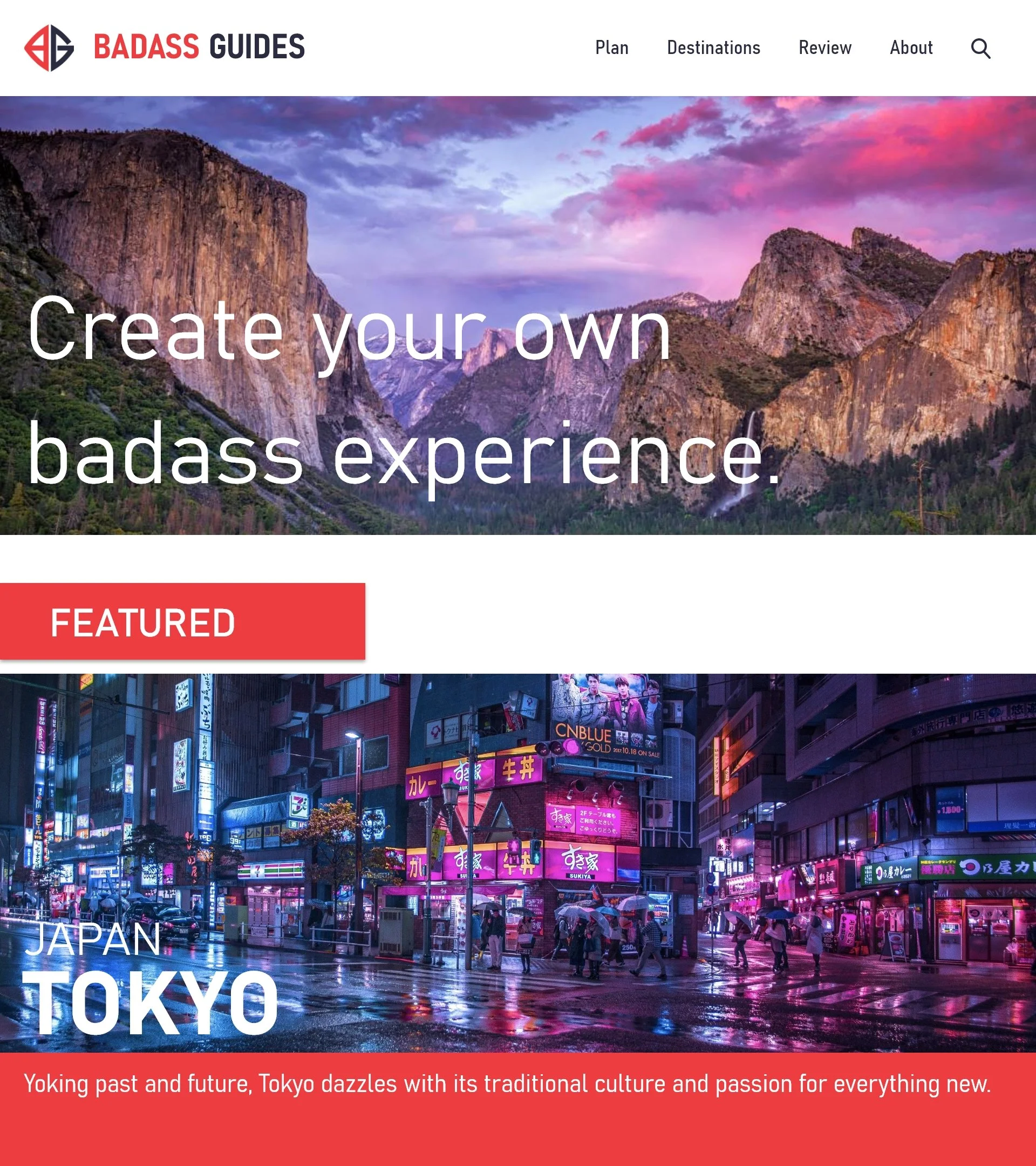 Branding and website designed for mock company "Badass Guides", a travel agency marketed to college students and young adults. The site is designed for the young adult demographic, with convenient features such as a review system, easy access pricing, and an all-in-one planning page.