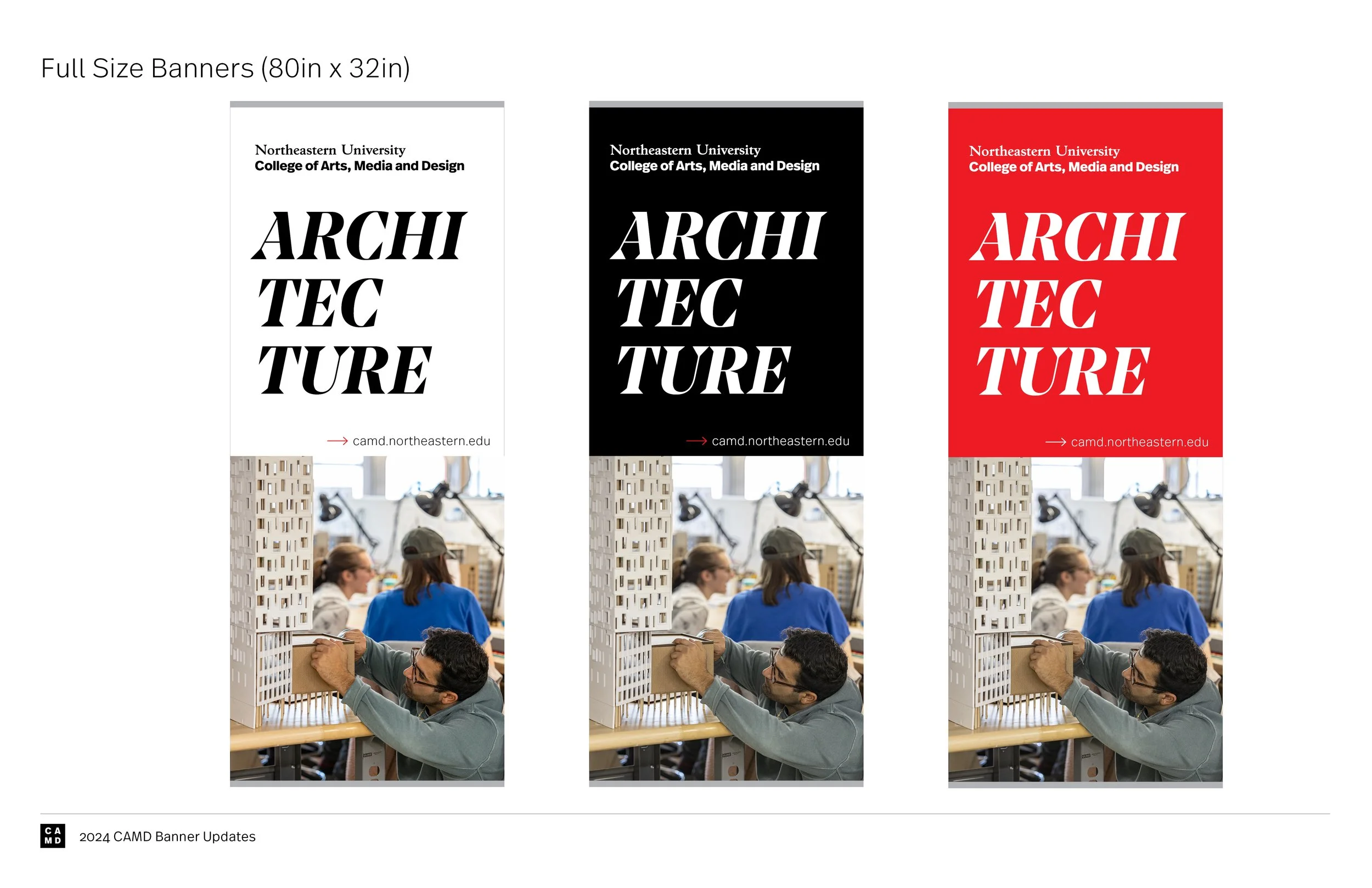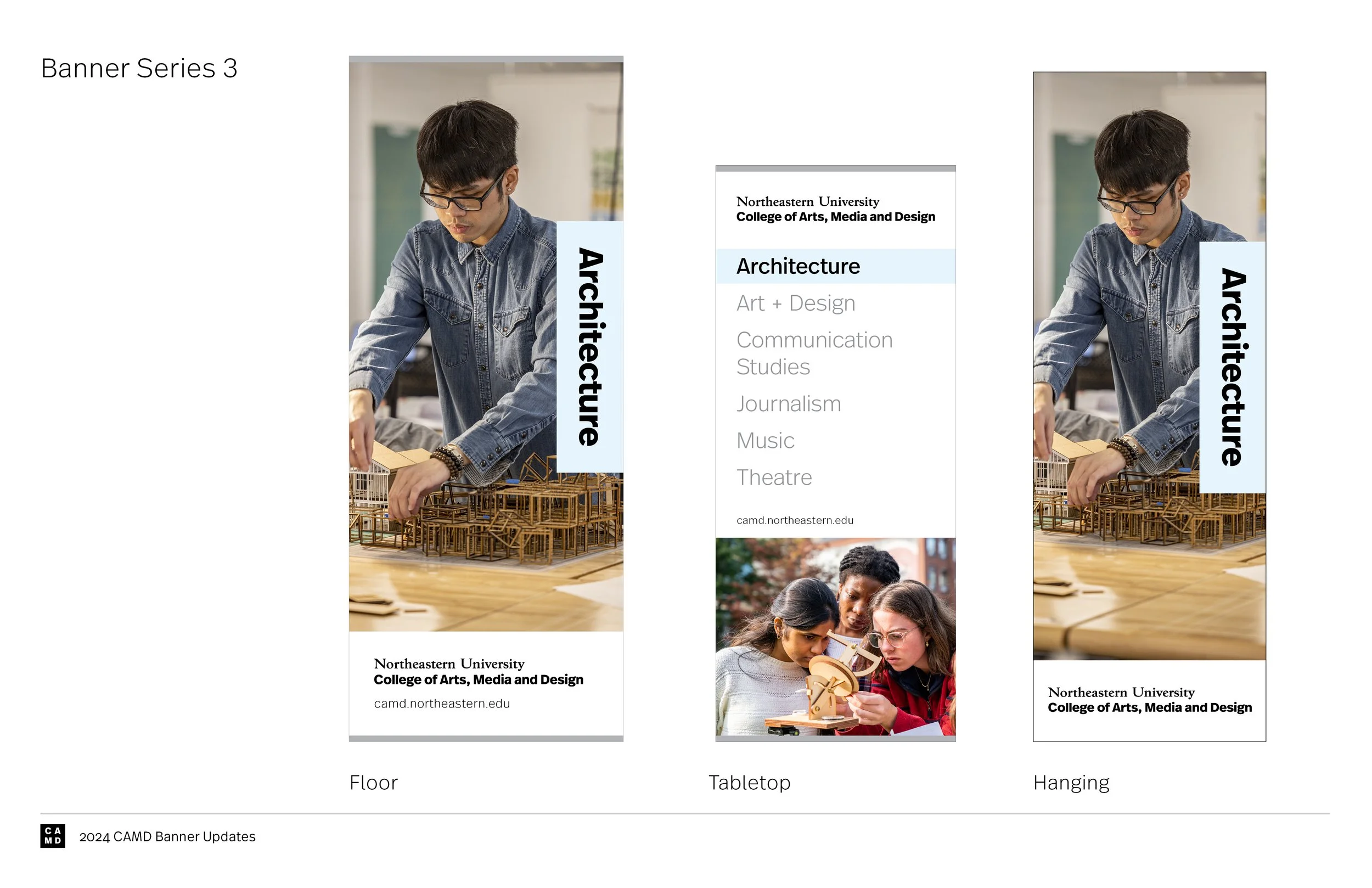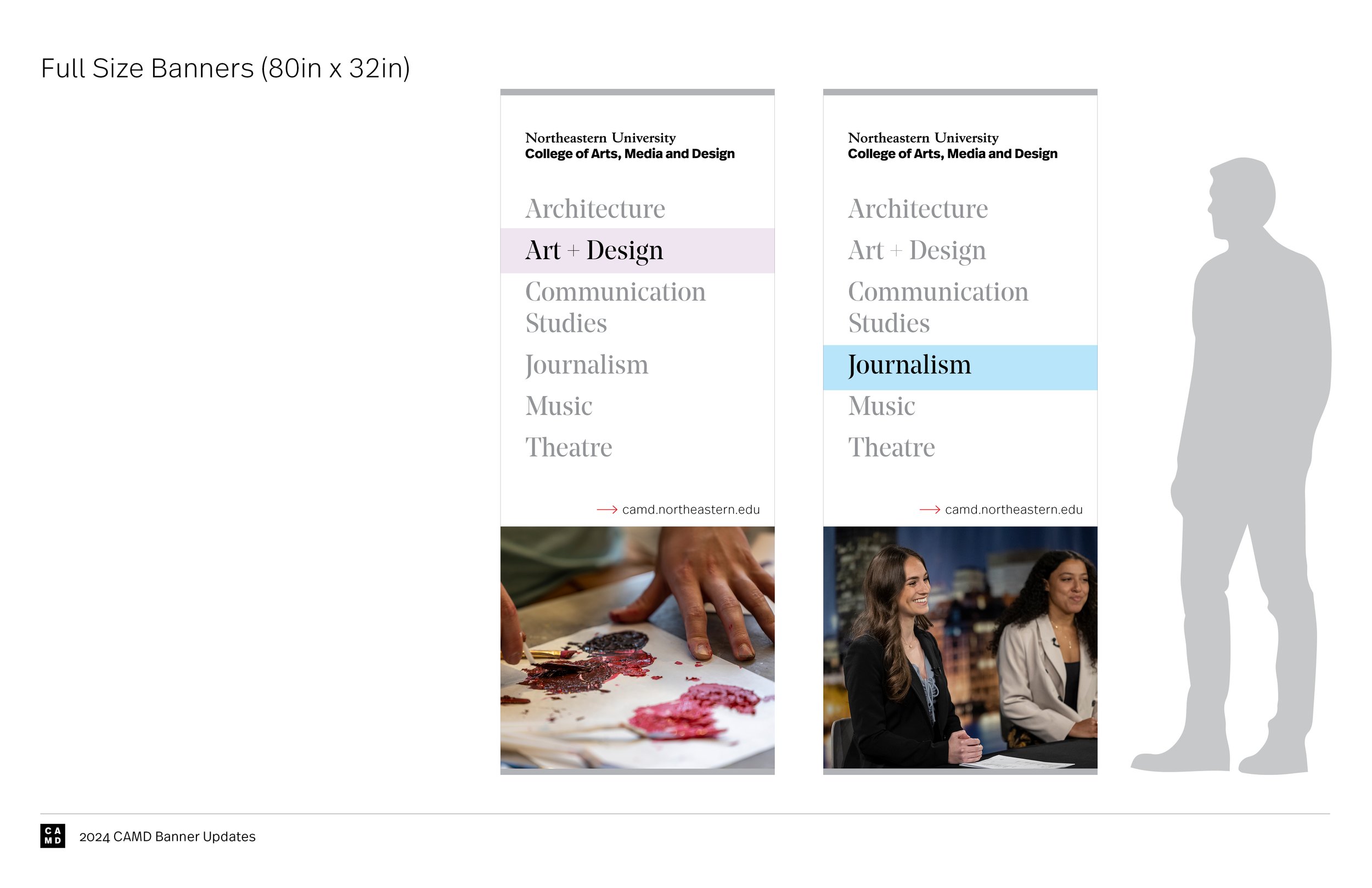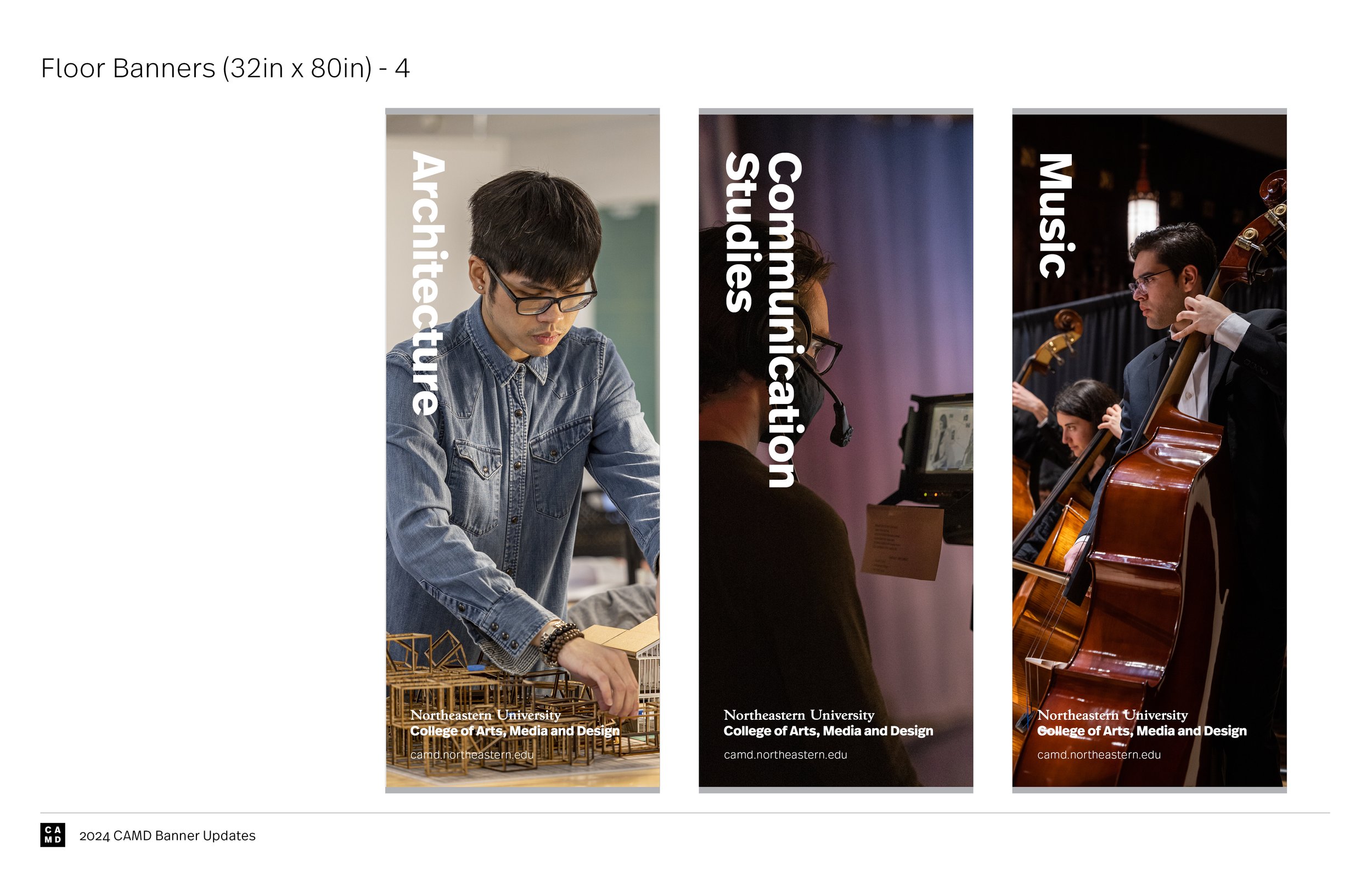 These banners are displayed at university events to advertise CAMD and its departments, so it was important that they highlight the college’s vibrance and diversity in both students and programs.
