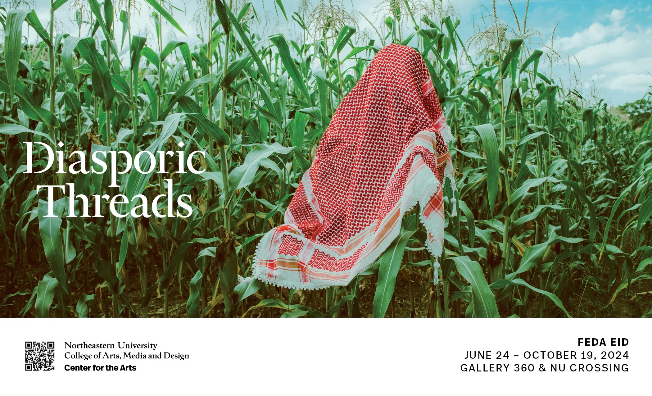 Wordmark and half-page magazine ad designed for Gallery 360 exhibition "Diasporic Threads" by Boston-based multimedia artist Feda Eid.